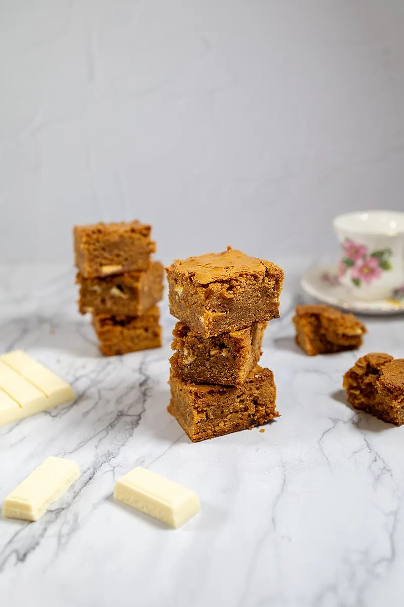 The exact time depends on your oven, the blondies should not be completely cooked. Let the blondies cool off completely and divide into bite-sized pieces. Enjoy!