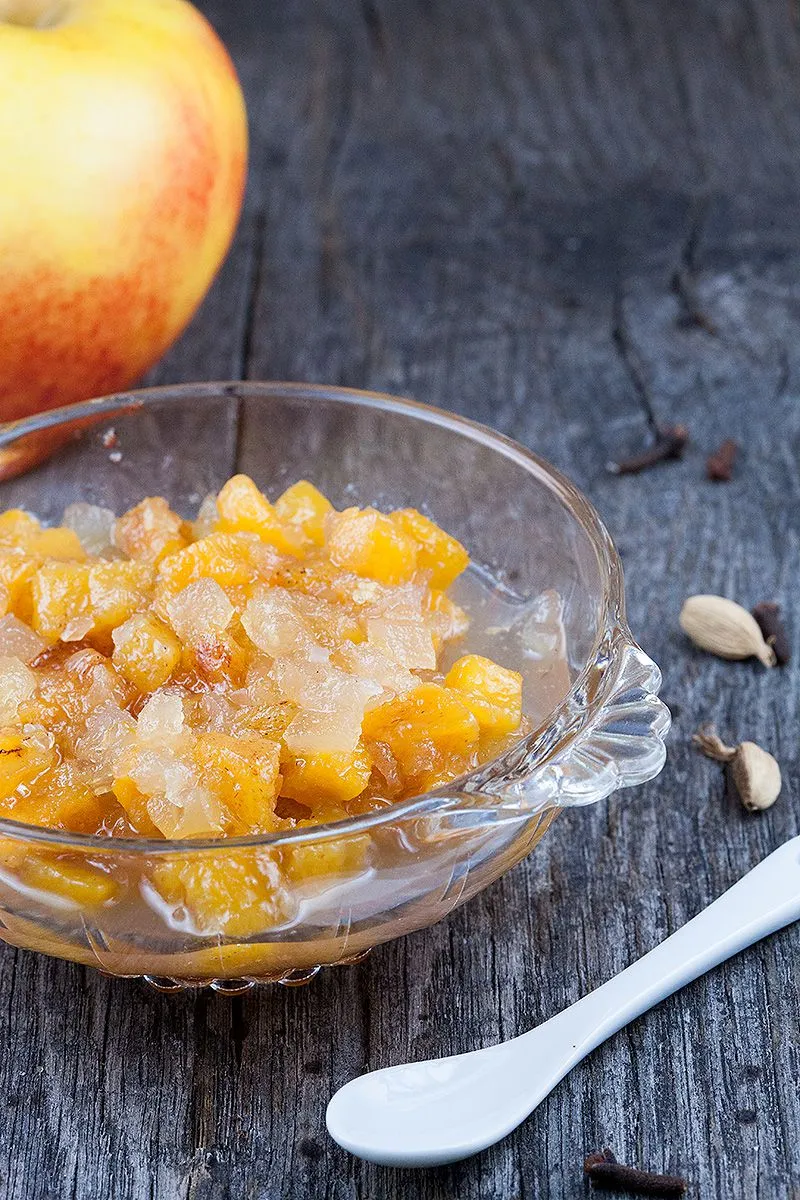 Peel the shallot. Wash and peel the peel the apple, then dice it. Add apple, shallot, cloves, cardamom pods, dried chili peppers, sugar and white wine vinegar into the medium-sized skillet.